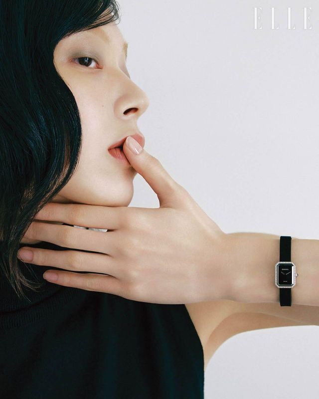 18K 화이트골드에 다이아몬드를 세팅한 숫자 5 모티프의 ‘N°5’ 이어링과 네크리스, 스틸 케이스에 블랙 래커 다이얼을 적용하고 두 줄의 스틸 체인 브레이슬릿으로 포인트를 준 ‘프리미에르 아이코닉 체인 더블 로우’ 워치는 모두 Chanel Watches & Fine Jewelry.