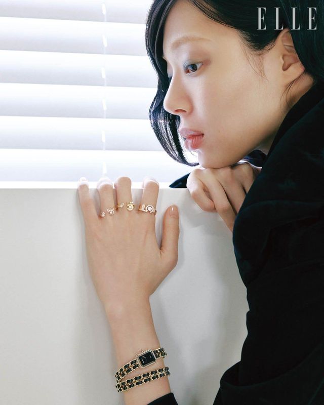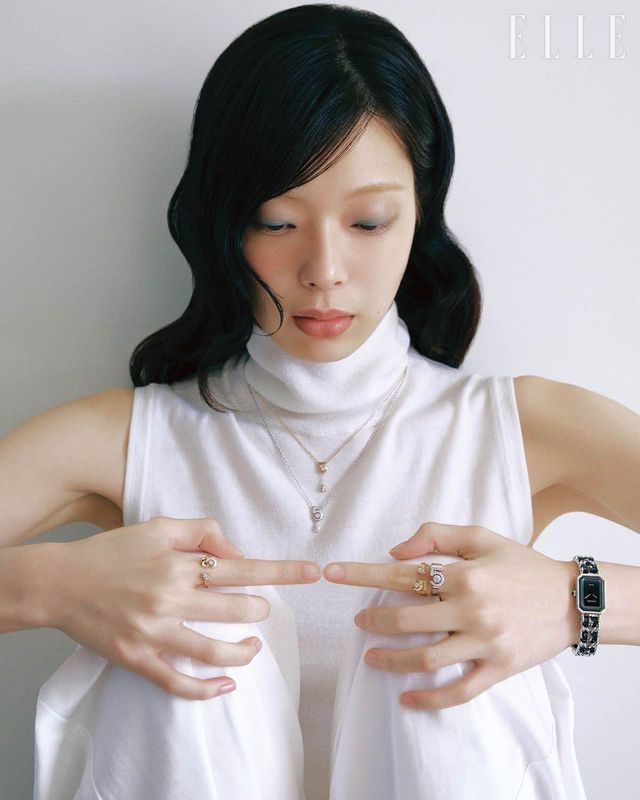 18K 베이지골드에 다이아몬드를 세팅한 ‘N°5’ 네크리스, 레이어드한 18K 화이트골드에 다이아몬드를 세팅한 ‘N°5’ 네크리스, 오른손 검지에 낀 18K 베이지골드 ‘N°5’ 링, 왼손 검지에 낀 18K 옐로골드 ‘N°5’ 링과 18K 화이트골드 ‘N°5’ 링, 스테인리스스틸 케이스에 스틸과 블랙 가죽 리본을 엮은 체인 브레이슬릿을 매치한 ‘프리미에르 아이코닉 체인’ 워치는 모두 Chanel Watches & Fine Jewelry.