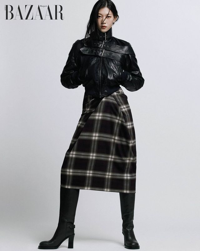 벨티드 가죽 재킷은 8백만원대 McQueen. 스커트는 22만원 Cos. 귀고리는 Hermès. 부츠는 2백91만원 Burberry.