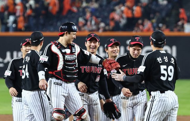 대전 한화생명볼파크에서 열린 프로야구 2025 신한 SOL뱅크 KBO 포스트시즌 한국시리즈 4차전 LG 트윈스와 한화 이글스의 경기, LG 선수들이 7대4 승리 후 기쁨을 나누고 있다. / 뉴스1