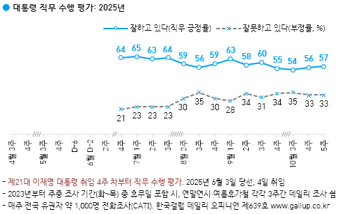 한국갤럽이 지난 28~30일 전국 만 18세 이상 남녀 1002명을 대상으로 이재명 대통령의 직무수행 평가를 조사한 결과 (95% 신뢰수준에 ±3.1% 포인트) '잘하고 있다'는 긍정평가는 57%, '잘못하고 있다'는 부정평가는 33%로 나타났다. 10%는 의견을 유보했다. 직전 실시된 조사에 비해 긍정은 1%p 상승했고, 부정은 동일했다.
