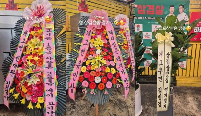 권재관-김경아 부부는 "고기는 1등급, 사장은 2등급. 에이 고기나 먹자", 임우일은 "탄 고기, 남는 고기 수거해드립니다"라고 응원을 보냈으며, "돼지 맛은 돼지가 안다"라는 유민상의 화환에 이상호는 "형 삼겹살 좀 팔아 줘"라고 부탁하기도 했다.