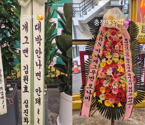 이어지는 사진에는 개그맨 동료들이 자신의 유행어를 활용한 센스 있는 축하 화환이 담겨 있어 눈길을 끈다. 김원효, 심진화 부부는 "대박 안 나면 안돼~~", 미녀 개그우먼 오나미는 "홍대 맛집♡ 일단 들어오세요. 들어오기 싫다고 하지 마~"라는 문구로 웃음을 자아냈다.