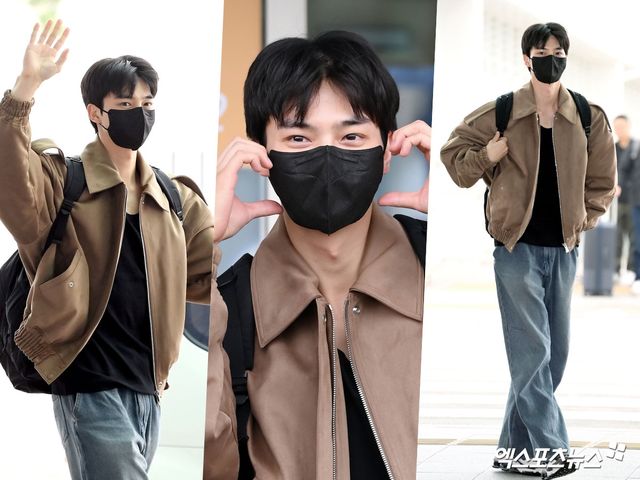 이날 그는 브라운 톤의 스웨이드 블루종 자켓에 블랙 티셔츠, 와이드 데님 팬츠를 매치해 여유롭고 캐주얼한 무드의 공항패션을 완성했다. 여기에 블랙 백팩과 스니커즈로 편안하면서도 세련된 포인트를 더했다.
