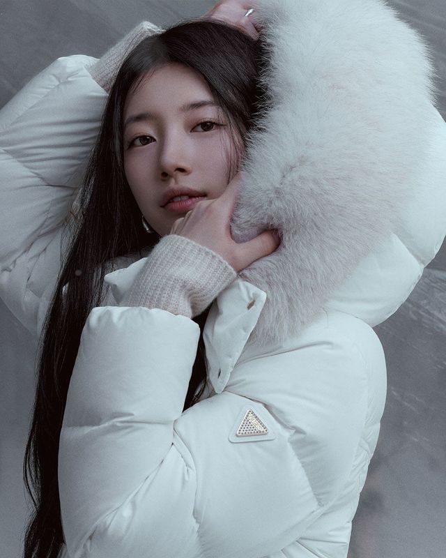 화이트 패딩은 잘 활용하면 눈부신 조명처럼 얼굴빛을 밝혀주는 완벽한 조력자가 되어줍니다. 차가운 계절 속에서도 오히려 따스한 온기를 전하는 색이니까요. 단순해서 더 매력적이기도 합니다. 어떤 룩에도 자연스럽게 스며들지만, 존재감은 결코 흐릿하지 않죠. 풍성한 실루엣 속에서도 공기처럼 가벼운 인상을 남기며, 얼굴 톤을 맑고 투명하게 정돈해 줍니다. 수지는 부드러운 퍼 후드 다운으로 차분하면서도 신비로운 분위기를 완성했습니다. 흐린 겨울 하늘 아래에서도, 마치 은은한 조명이 켜진 듯 얼굴이 환하게 피어오르죠.