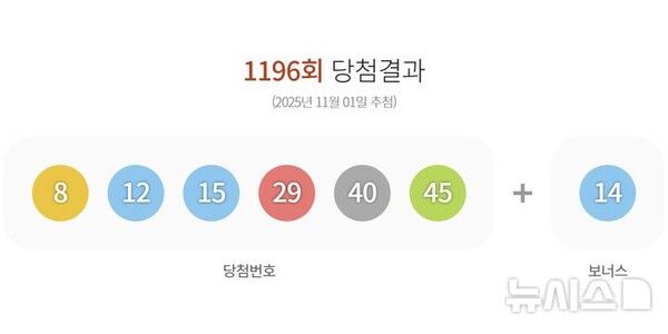 1일 제1196회 동행복권 로또 추첨 결과 8, 12, 15, 29, 40, 45가 1등 당첨 번호로 결정됐다. 2등 보너스 번호는 14이다.