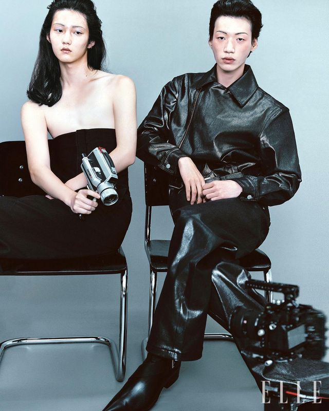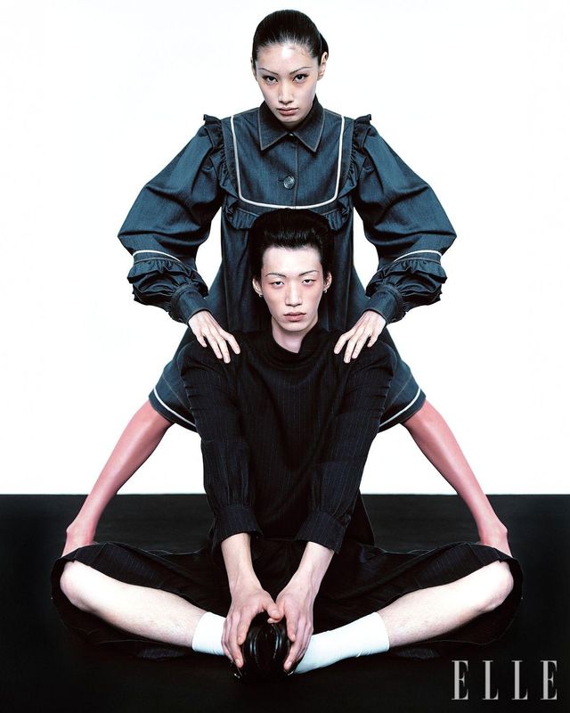 유엔신이 입은 데님 프릴 원피스는 2백98만원, Miss Gee Collection. 스틸레토 힐은 가격 미정, Jimmy Choo. 승민이 입은 블랙 톱과 팬츠는 가격 미정, 모두 Andy & Debb. 로퍼는 가격 미정, Celine. 스타킹과 삭스는 모두 에디터 소장품.