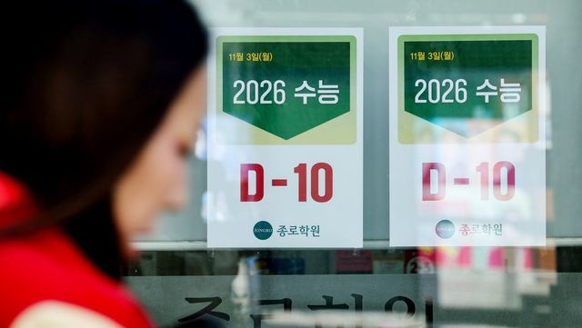 2026학년도 대학수학능력시험이 열흘 앞으로 다가온 가운데 2일 서울 마포구 종로학원에 수능 D-10 안내문이 붙어 있다. / 연합뉴스