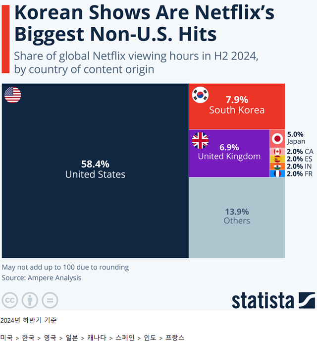 2024년 하반기 넷플릭스 글로벌 시청 시간 분석 결과, 한국 콘텐츠는 7.9%의 점유율로 미국(58.4%)을 제외한 전 세계 국가 중 가장 높은 인기를 얻었습니다.