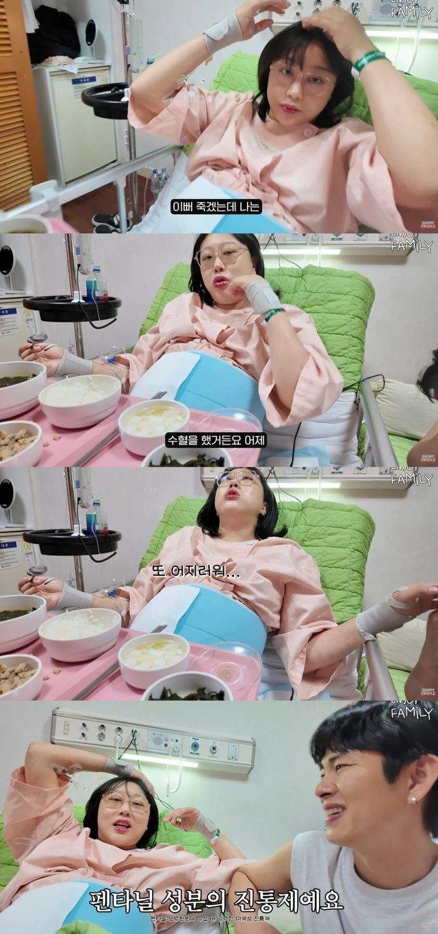 그는 “어제 피를 너무 많이 쏟아가지고 수혈을 했다. 그런데도 (피) 수치가 하나도 안 올라서 또 어지럽다”며 여전히 이어지는 빈혈 증상과 어지러움을 호소했다. 이어 투여받은 진통제가 마약성 진통제인 펜타닐 성분이었다고 고백하며 “얼마나 이게 (제왕절개) 고통스러우면은 이걸로만 줄일 수 있는 거겠냐. 치료용이니까”라고 털어놨다.