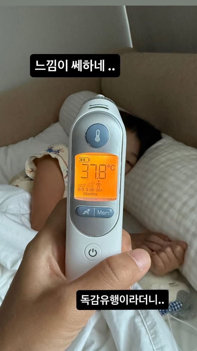 이지혜는 전날 "느낌이 쎄하네.. 독감유행이라더니.."라며 37.8가 찍힌 온도계를 공개한 바 있다.