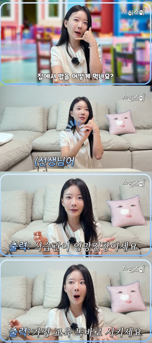 윤소희는 “유치원·어린이집 선생님들은 많은 아이들을 편견 없이 바라봐야 하는 직업이기 때문에, 보는 시각이 정말 정확하다”고 설명했다. 이어 “어느 날 선생님께서 ‘어머님, 우찬이가 집에서 밥을 어떻게 먹나요?’라고 전화가 온 적이 있다. 이 말은 곧 ‘아이 식습관이 조금 걱정됩니다’라는 신호다. 학부모 입장에서 돌려 들을 줄 알아야 한다”고 자신의 경험을 전했다.
