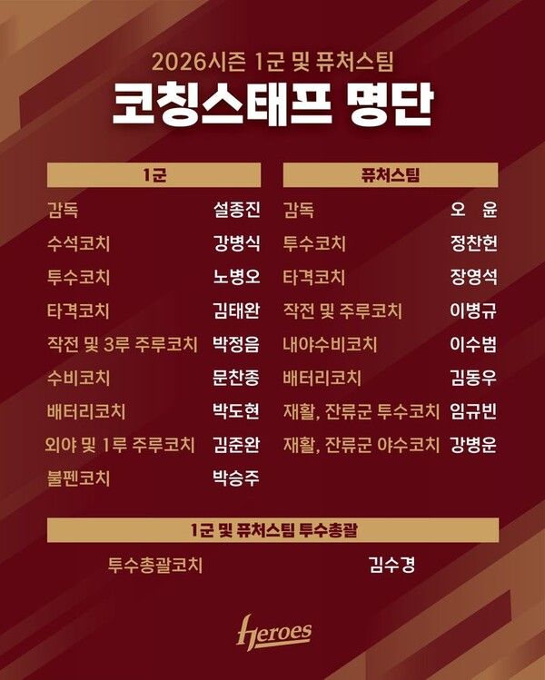 김 총괄코치는 2008년부터 2012년까지 히어로즈에서 뛰었다. 1군, 퓨처스팀 투수코치들과 함께 투수진 육성 방향을 수립할 예정이다.