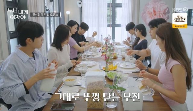 남성 출연자들이 이미 준비를 끝내고 모인 사이 여성 출연자들은 늦게 일어나 합류했다. 김무진과 구본희는 아침 인사부터 자연스럽게 대화를 나누었고, 서로를 지켜봤다. 김무진은 구본희 옆에 앉았고, 그 앞에 앉은 박지원은 미소를 보였다. 하지만 김무진은 구본희에게만 우유를 챙겨주었다.