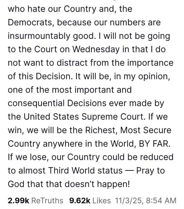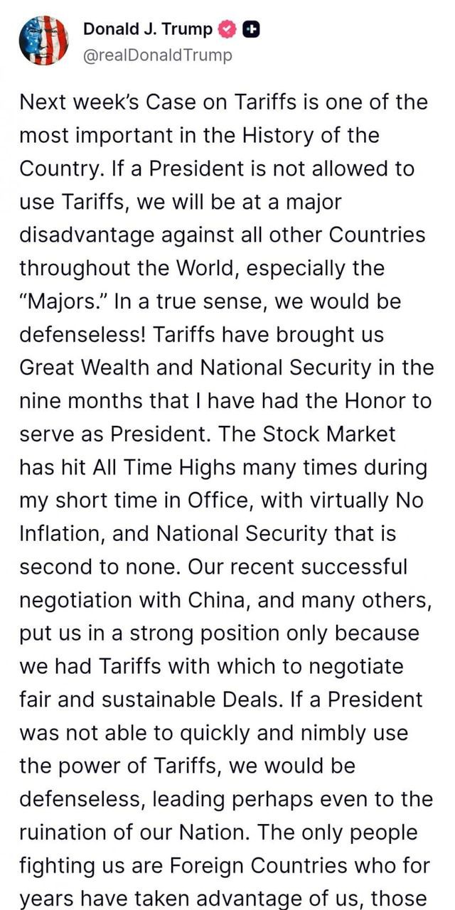 다음 주 관세에 관한 소송은 우리나라 역사상 가장 중요한 사건 중 하나입니다. 만약 대통령이 관세를 사용할 수 없다면 우리는 세계의 다른 나라들, 특히 주요 국가들과 비교해 큰 불리함에 처하게 됩니다. 사실상 우리는 방어 능력을 잃게 될 수도 있습니다.