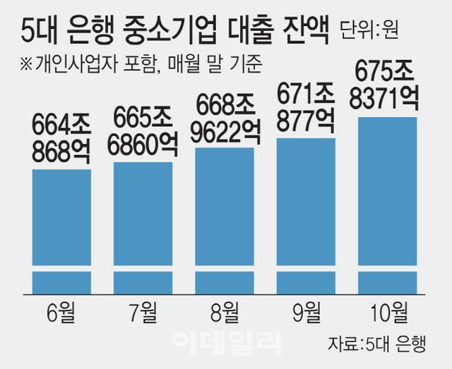 3일 은행권에 따르면 KB국민·신한·하나·우리·NH농협 등 5대 은행의 지난달 말 중소기업대출 잔액은 675조 8371억원으로 집계됐다. 지난달 말(671조 877억원)보다 4조 7494억원 늘었다. 6월 말(664조 868억원)과 비교하면 하반기 들어서만 11조 7503억원 급증했다. 올 상반기 증가액(1조 8578억원)의 6배 이상이다. 대기업 대출 잔액은 6월 말 165조 6515억원으로 10월 말 170조 4688억원으로 4조 8173억원 증가했다. 이로써 전체 기업대출은 하반기 들어 10월(846조 3059억원)까지 16조 5676억원 늘었다.