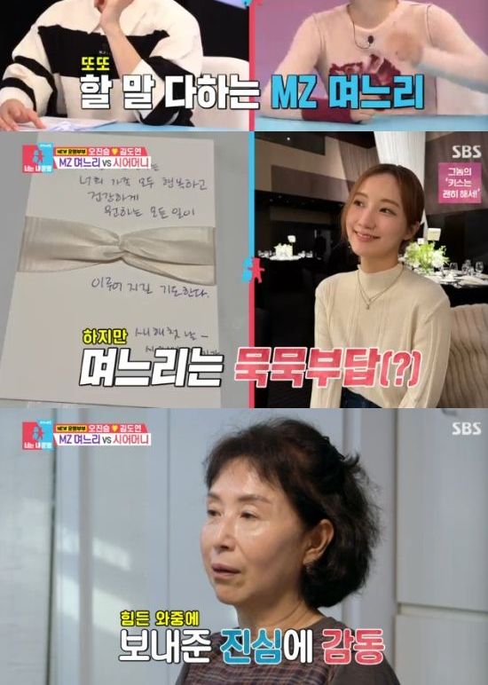 또 시어머니는 손편지에 답장을 하지 않은 며느리 김도연에게 서운했다면서 "몇 번을 손편지를 써줬으면 한 번정도는 답장이 올만도 한데, '쟤가 무슨 생각을 하고 있지?'라는 생각이 들었다. 서운했다"고 했다. 하지만 이제는 편지에 답장을 잘 쓴다면서 고마워했다.