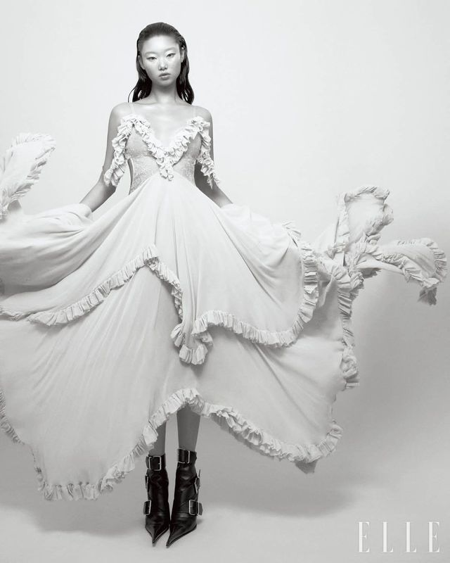 러플 장식의 시어 드레스와 버클 디테일의 앵클부츠는 가격 미정, 모두 McQueen.