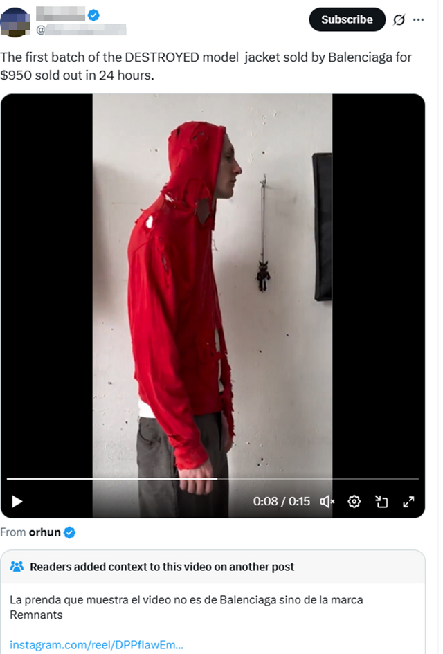 발렌시아가 제품이 24시간 만에 완판됐다고 주장한 영상 게시물. 다만 영상 속 옷은 발렌시아가가 아닌 타 브랜드 ‘렘넌츠(Remnants)’ 제품이다. 사진=X 갈무리