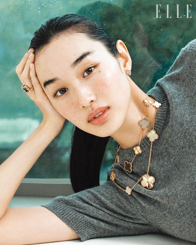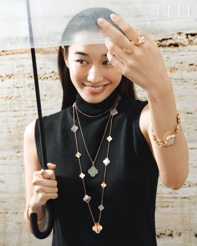 화이트골드와 칼세도니, 마더 오브 펄을 세팅한 매직 알함브라 트랜스포머블 롱 네크리스와 오른손 검지에 착용한 화이트골드와 칼세도니의 빈티지 알함브라 리버서블 링, 약지에 착용한 화이트골드에 다이아몬드를 세팅한 뻬를리 스위트 클로버 링, 스위트 알함브라 워치, 4-모티브 브레이슬릿으로 연출한 화이트골드 매직 알함브라 트랜스포머블 롱 네크리스, 왼손 검지에 착용한 화이트골드와, 마더 오브 펄, 다이아몬드 세팅한 빈티지 알함브라 링, 반클리프 아펠 로고 인그레이빙이 돋보이는 화이트골드 뻬를리 시그니처 브레이슬릿은 모두 Van Cleef & Arpels. 블랙 미니드레스는 Cos.