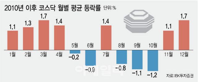 계절적으로도 코스닥에 유리한 시점이다. 통상 국내 증시에서 1분기는 코스닥이 강세 현상을 보이며 겨울 초입인 11~12월부터 선제적으로 저가 매수세가 유입된다. 실제 2010년 이후 지난해까지 코스닥 월별 평균 등락률을 보면 8~10월 마이너스에서 11월부터 1.1%로 반등해 1분기까지 1%대를 이어왔다.