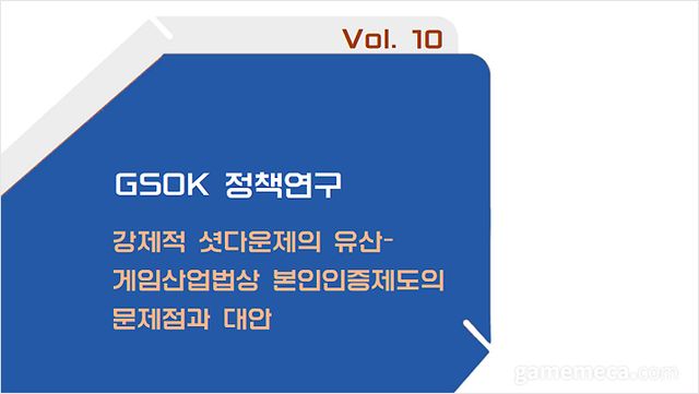 한국게임정책자율기구(GSOK)는 3일 게임계의 주요 정책을 분석하는 'GSOK 정책연구' 제10호 보고서로, 게임법 내 본인인증 및 동의확보제도를 다룬 '강제적 셧다운제의 유산- 게임산업법상 본인인증제도의 문제점과 대안'을 발간했다.