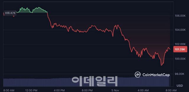 글로벌 가상자산 시황 중계 플랫폼 코인마켓캡에 따르면 비트코인은 5일 오전 6시 35분 9134 달러를 기록하며 이후 비트코인 다시 10만 달러대를 회복해 7시 43분 기준 비트코인(BTC) 가격은 24시간 전 대비 4.71% 하락한 10만 1328달러를 기록했다. 일주일 전과 비교하면 10% 넘게 하락했다.