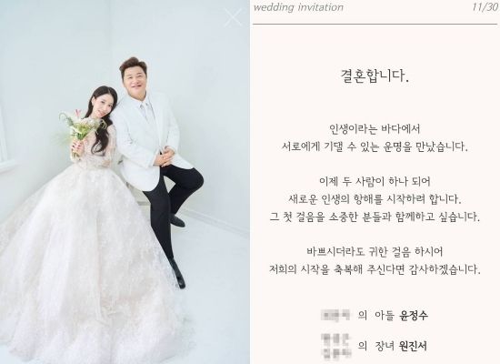 (엑스포츠뉴스 황수연 기자) 윤정수와 원진서가 오는 30일 결혼을 앞두고 청첩장과 웨딩화보를 공개했다.
