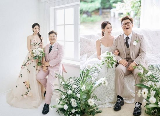 함께 공개한 웨딩화보도 화제를 모으고 있다. 윤정수는 깔끔한 화이트 슈트 차림으로, 순백의 드레스를 입은 원진서와 함께 다정하게 포즈를 취했다. 단아하면서도 우아한 매력의 원진서의 미모가 돋보였다.