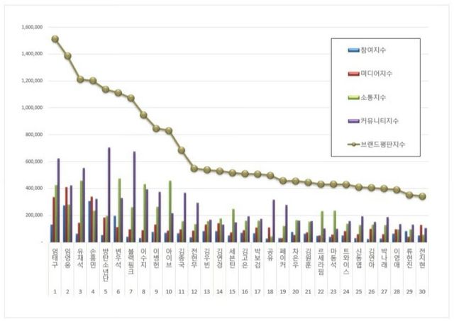 2위 임영웅 브랜드는 참여지수 27만 4208, 미디어지수 41만 1077, 소통지수 27만 9152, 커뮤니티지수 42만 1345로, 총 브랜드평판지수 138만 5782로 분석됐다. 이는 지난 10월 브랜드평판지수 172만 5371과 비교해 19.68% 하락한 수치이다.
