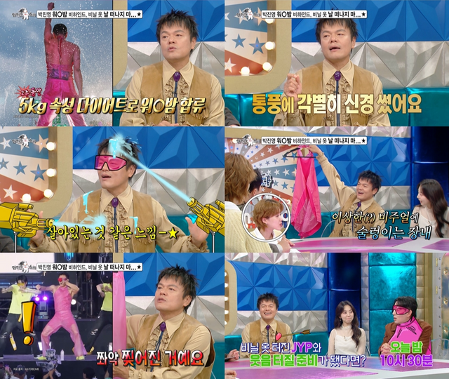 또한 박진영은 무대에서 입었던 의상을 가져와 스튜디오에서 공개했다. 그는 “옷만 보시면 ‘저거 이상해’라고 생각하실 텐데…”라며 조심스럽게 의상을 꺼냈다. 눈앞에 등장한 핫핑크 비닐 옷에 스튜디오는 술렁였다.