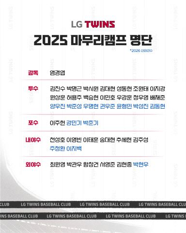 반면 투수 박명근, 박시원, 포수 이주헌, 내야수 천성호, 이영빈, 외야수 최원영 등 한국시리즈 엔트리에 포함됐지만 출전 기회를 많이 얻지 못한 선수들은 마무리 캠프에 합류했다.