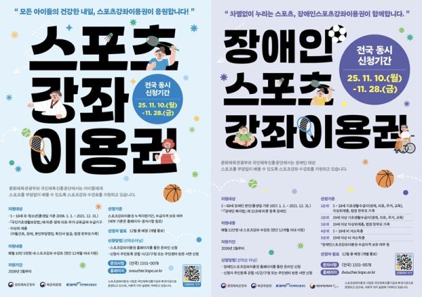 스포츠강좌이용권 대상은 5~18세(2008~2021년 출생)의 ▲생계/의료/주거/교육급여 수급가구 또는 ▲차상위계층 및 한부모가족지원법에 따른 한부모가족 ▲경찰청 추천을 받은 범죄피해가정이며 장애인스포츠강좌이용권 신청 대상은 ▲5~69세(1957~2021년 출생) 장애인이다. 선정된 대상자는 2026년 1월부터 12월까지 월 최대 10만5000원, 11만원까지 지원받게 된다.