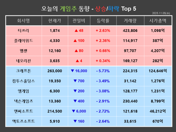 반면, 크래프톤은 금일(5일) 전거래일 대비 5.73%(16,000원) 하락한 263,000원에 장을 마감했다. 개인과 외국인이 각각 35,143w, 5,036주를 순매수한 반면, 기관이 42,279주를 순매도하면서 장 초반부터 하락해 약세로 마쳤다.