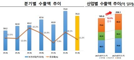 보건산업 수출은 전년 동기(185.0억 달러) 대비 12.5% 증가한 208.1억 달러를 기록하며 3분기 누적 기준 역대 최고 실적을 경신했다.