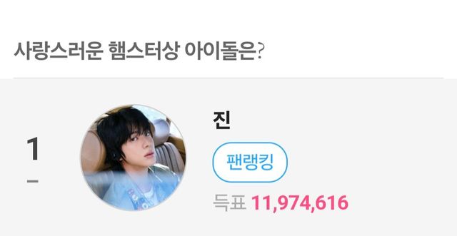 진은 9월 15일부터 10월 13일까지 팬앤스타(Fannstar)에서 진행된 ‘사랑스러운 햄스터상 아이돌은?’ 설문에서 총 1197만4616표를 획득, 압도적인 표 차로 정상에 올랐다.