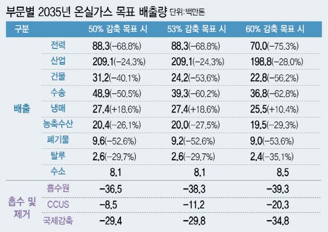 산업계는 다만 실질적 부담이 될 하한선이 53%(2안)에서 50%(1안)로 더 내려갈 수 있다는 점에 기대를 걸고 있다. 전력·산업 부문의 감축 목표에는 변동이 없지만, 건물·수송 부문의 감축 목표 하한선이 크게 바뀐다.