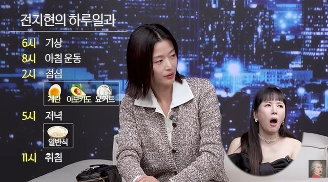 또 전지현은 “항상 단백질을 먼저 먹는다. 계란, 아보카도, 야채 위주로 먹고 조금 더 먹고 싶으면 그릭 요거트를 먹는다”라며 “탄수화물을 무조건 안 먹는 건 아니다. ‘난 먹고 싶은 거 다 먹을 수 있는 사람이야’라고 일단 생각을 한다. 그래도 제 몸에 좋은 걸 먹어야겠다고 생각하면서 먹는다. 근데 점심 약속 있으면 다 먹긴 한다”라고 자신의 식단관리 비법을 공개했다. 이어 그는 “오후 5시쯤 일반식으로 일찍 먹고 밤 11시쯤 자는 편이다. 저녁엔 방전되는 스타일이라 술도 거의 하지 않는다”라고 덧붙였다.