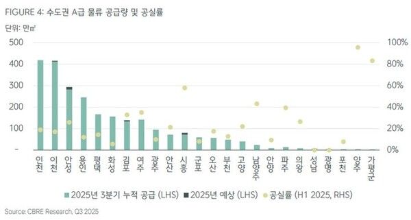 7일 상업용 부동산 전문기업 CBRE코리아에 따르면 3분기 수도권 A급 물류센터 신규 공급량은 37만4861㎡로 나타났다. 올해 누적 공급량은 76만5020㎡를 기록하며 전년 동기 대비 약 68% 감소했다.