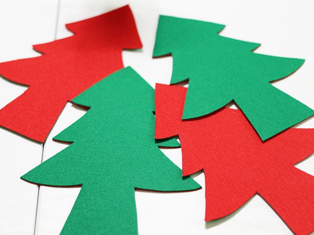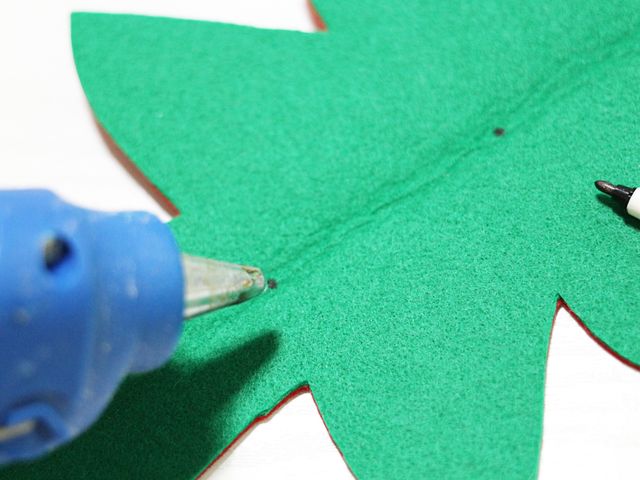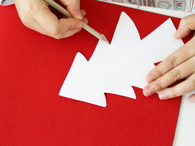 펠트지에 트리 모양 도안을 대고 밑그림을 그려요.