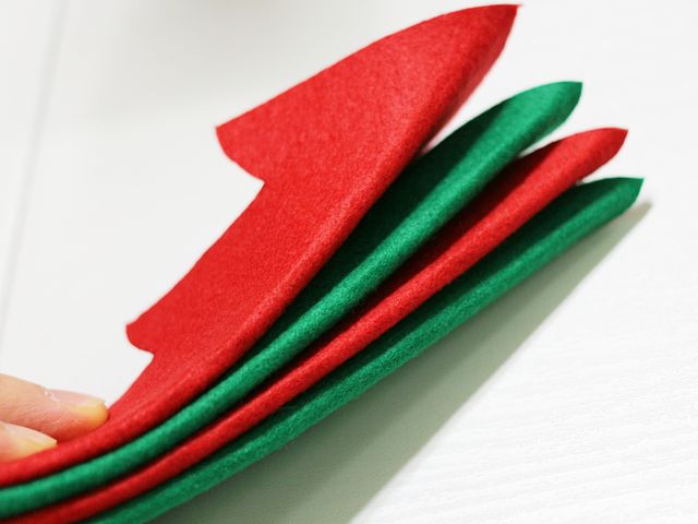 트리 모양 펠트지를 세로로 반을 접어 주시고요.