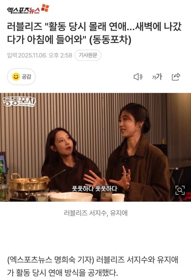 러블리즈 "활동 당시 몰래 연애…새벽에 나갔다가 아침에 들어와" (동동포차)