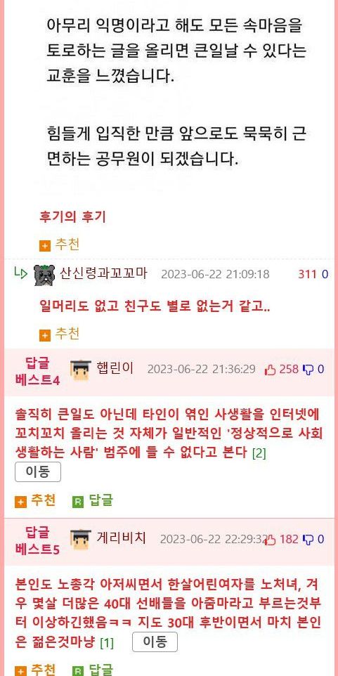 8급선임에게 따로 (글올린것) 사과했고 대화중에 저런 댓글 올린 적 없고 사실관계도 다르며