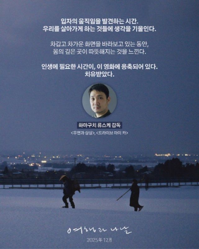 12월 10일 개봉을 앞둔 ‘여행과 나날’은 어쩌면 끝이라고 생각한 각본가 이가 어쩌다 떠나온 설국의 여관에서 의외의 시간을 보내면서 다시 시작되는 2025년 겨울, 일상 여행자들과 함께 떠나는 꿈같은 이야기를 그린다. ‘너의 새는 노래할 수 있어’, ‘너의 눈을 들여다보면’, ‘새벽의 모든’까지 베를린국제영화제에 연이어 초청되며 현시점 가장 주목받는 일본 영화계의 차세대 감독으로 자리매김한 미야케 쇼의 신작이다. 배우 심은경이 주인공 각본가 이 역을 맡아 일찌감치 스포트라이트를 받았다.