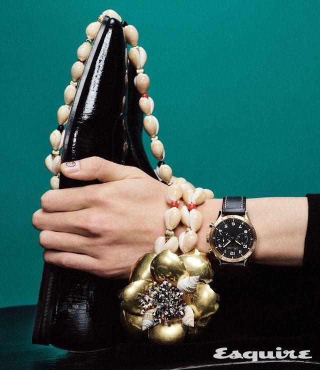 블랙 알루미늄 다이얼로 남성미를 부각한 타입 XX 크로노그래프 2075 워치 7900만원대 브레게. 재킷, 시폰 블라우스, 팬츠 모두 가격 미정 발렌티노. 부츠, 플라워 모티브 네크리스 모두 가격 미정 발렌티노 가라바니.