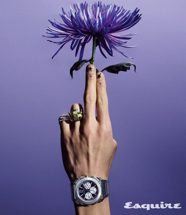 43mm 케이스에 크로노그래프 GMT 무브먼트를 탑재한 옥토 피니씨모 크로노그래프 워치 2470만원, 오닉스와 다이아몬드로 장식한 디바스 드림 이어링 480만원대 모두 불가리. 레더 코트 1600만원대, 터틀넥 톱 200만원대, 팬츠 100만원대 모두 펜디. 다이아몬드를 파베 세팅한 앙티페 링 2000만원대 레포시. 돼지 모티브 링 에디터 소장품.