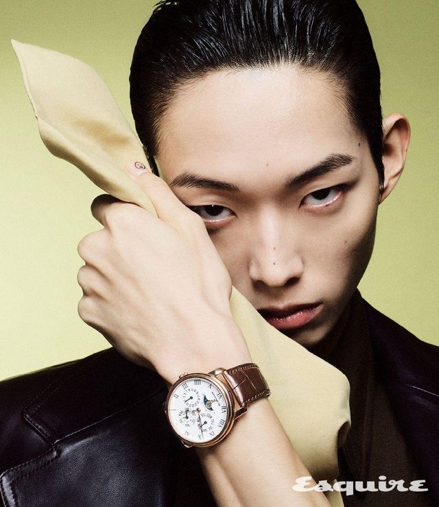 42mm 레드 골드 케이스에 화이트 에나멜 다이얼을 매치한 빌레레 퍼페추얼 캘린더 8데이즈 워치 9900만원대 블랑팡. 레더 재킷, 실크 셔츠, 팬츠, 타이 모두 가격 미정 아미리. 벨트 가격 미정 아워레가시. 다이아몬드로 장식한 하드웨어 라지 링크 옐로 골드 브레이슬릿 가격 미정 티파니.