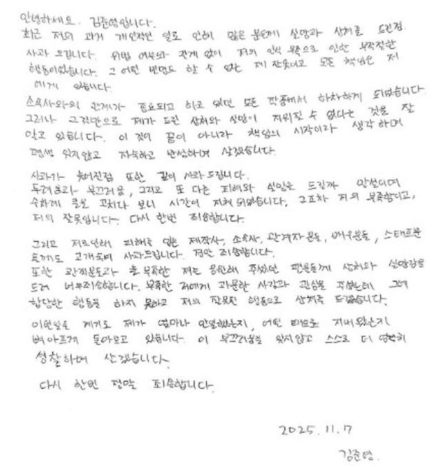 그러면서 “사과가 늦어진 점 또한 깊이 사과드린다”라며 “두려움과 부끄러움, 그리고 또 다른 피해와 실망을 드릴까 망설이며 수차례 글을 고치다 보니 시간이 지체되었다. 그조차 저의 부족함이고, 저의 잘못이다”라고 털어놨다.