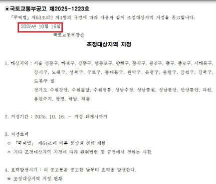 앞서 정부는 10·15부동산대책에서 서울 전지역(25개구)과 경기도 12개 등 모두 37개를 조정대상지역(조정지역)으로 지정했습니다. 조정지역으로 지정되면 각종 주택담보·전세자금 대출 규제 외에도 △수도권 3년, 지방 1년 전매제한 △다주택 양도소득세 중과 △장기보유특별공제 배제 △양도세 1세대1주택 비과세 요건 강화 △재건축 조합원당 주택 공급수 1주택 제한 등의 규제를 받습니다.