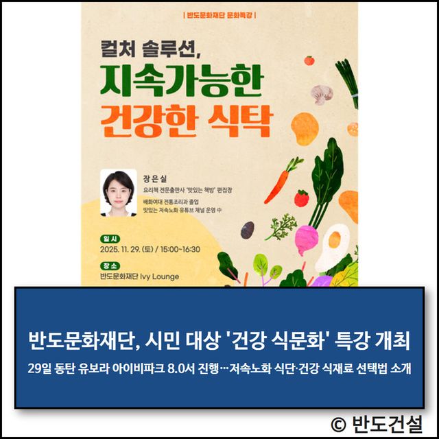 반도건설이 설립한 반도문화재단이 시민들을 대상으로 건강한 삶의 가치를 전하는 문화특강을 진행한다고 7일 밝혔다. 이번 특강 주제는 '컬처 솔루션, 지속가능한 건강한 식탁'으로 바른 식문화를 기반으로 한 일상 속 건강 실천 방법을 제안한다.